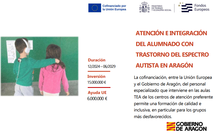 Este centro educativo participa en la actuación TEA-FSE+ (Atención e integración del alumnado con Trastorno del Espectro Autista), enmarcada en el Programa FSE+ Aragón2021–2027, cofinanciada por el Fondo Social Europeo Plus.El objetivo de esta actuación es mejorar la atención educativa, …